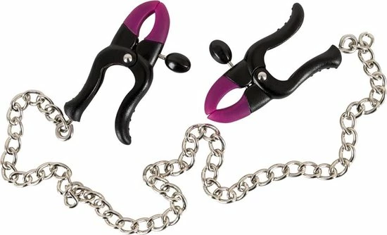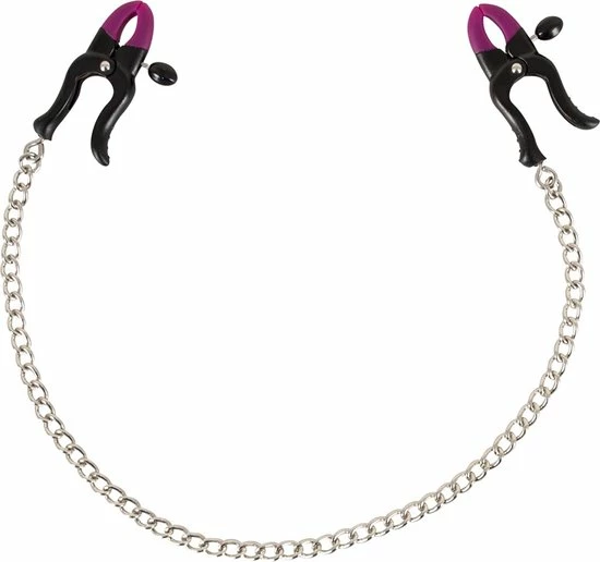 Pijn en genot gaan hand in hand met deze mooie tepelklemmen. Tussen de twee klemmen zit een stevige stalen ketting. De topjes van de klemmen zijn gemaakt van zacht siliconen voor een veilig gebruik en met de handige schroeven aan de zijkant van de klemmen kun je eenvoudig de druk op je tepels aanpassen.