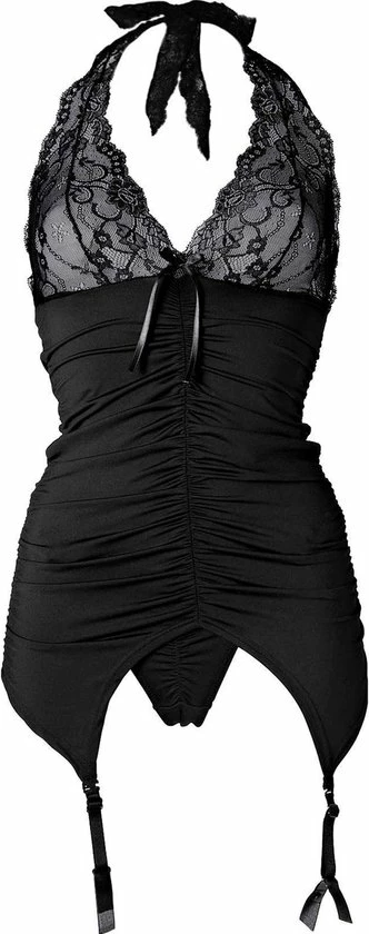 Een échte topper uit onze Christine le Duc collectie! Prachtige jarretel top met bijpassende string. De top heeft een geplooid buikgedeelte voor het verdoezelen van oneffenheden, tevens heeft het een optisch afslankend effect. Het buste gedeelte is gemaakt van semi-transparant kant. De sluiting is een haltermodel. De bovenrug is ontbloot.