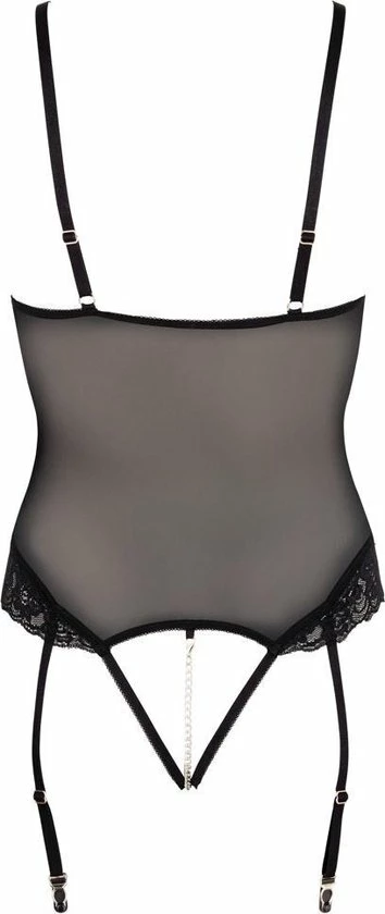 Open cup body met jarretelles. Het lichaam is gemaakt van powernet en kant, en heeft metalen details en wetlook accessoires. Er is een verwijderbare, stimulerende keten (klikhaken) via overigens open kruisgebied. De BH bandjes zijn verstelbaar. De jarretelles zijn verstelbaar en verwijderbaar.
