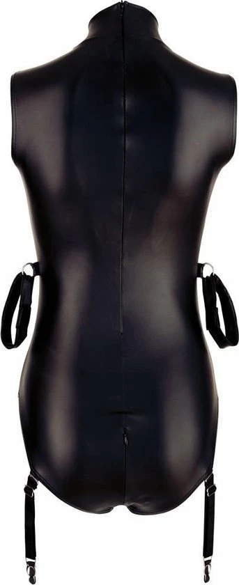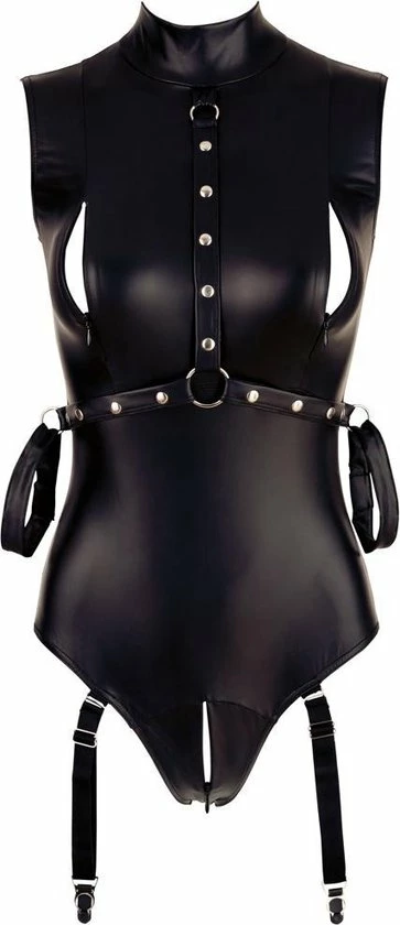 Een elastische lichaam in een matzwarte look met metalen details en jarretelles.