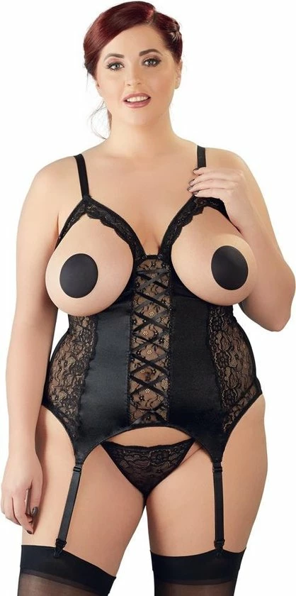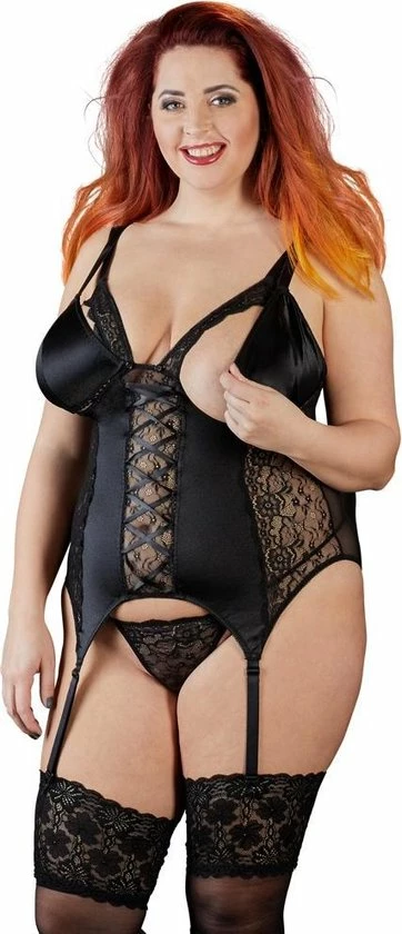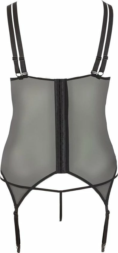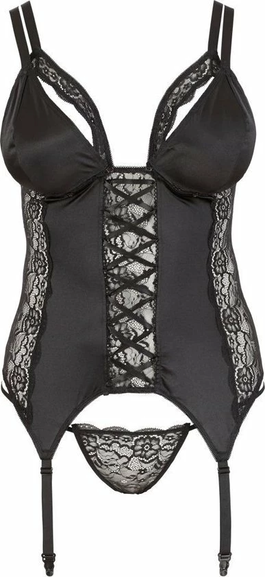 De Baskische is gemaakt van kant en satijn en er is een kant koord ook inbegrepen. De cups en een set banden kan volledig (drukknopen) worden verwijderd. Een set van beha-bandjes en jarretelles zijn verstelbaar.