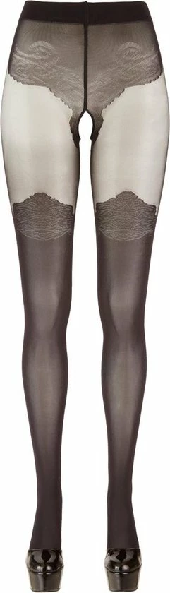 De look van een paar sexy kousen in het gemak van een panty. Het kan met deze zwarte panty uit de Cottelli Collection. Deze mooie panty is gemaakt van een zachte, super rekbare stof met een dikte van 40 denier. Hierdoor sluit de panty perfect aan op jouw benen en heupen zonder teveel huid te laten doorschijnen. Door de bijzondere details op de onder- en bovenbenen, ontstaat er een kousen look. Het lijkt dus net alsof jij kousen draagt. Draag deze panty onder een sexy jurkje of rokje en ga voor een verleidelijke maar stijlvolle look. Verras vervolgens je partner wanneer je je rokje of jurkje omhoog doet. De panty is namelijk voorzien van een open kruis zodat jij direct klaar bent voor het echte werk!