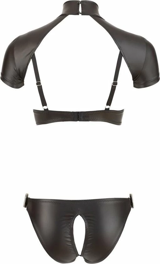 Body met licht voorgevormde, beugelcups, verstelbare bandjes, een opstaande kraag met 2 knopen aan de achterkant en een verstelbare band die loopt van de kraag aan het broekje. De slips zijn crotchless heeft gespen aan de zijkanten aan te passen. De kraag en korte mouwen kan volledig worden verwijderd. 90% polyester, 10% elastaan.