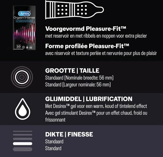 De Durex Orgasm?Intense-condooms zijn ideaal om je partner nog intenser te laten genieten. De ribbels en nopjes zorgen voor extra stimulatie en de condooms zijn voorzien van een speciaal glijmiddel met een warm, koud of tintelend effect dat je partner een nog intenser orgasme zal bezorgen.