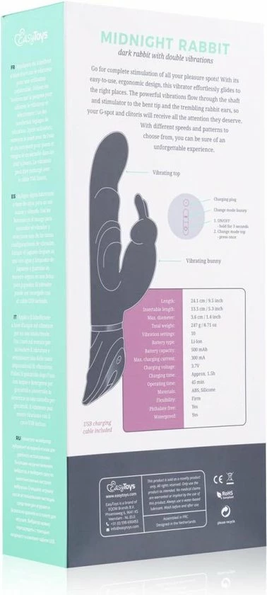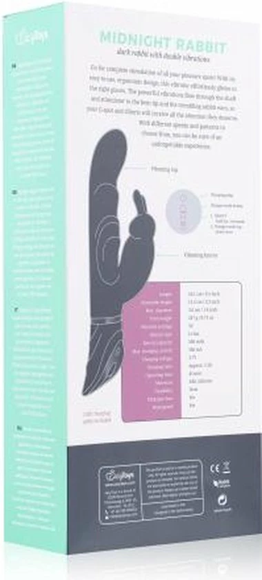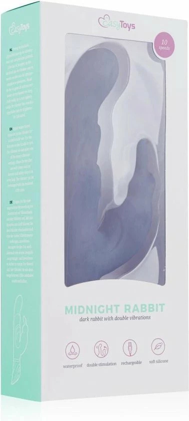 Stimuleer al je gevoelige plekjes tegelijkertijd met de Midnight rabbit vibrator! Deze mooie vibrator stimuleert je clitoris met zijn trillende bunny oortjes en masseert je G-spot met de gebogen top van de schacht. Hierdoor beleef je een overweldigend genot die je steeds weer opnieuw zal willen ervaren. De vibrator is voorzien van 2 motoren (1 in de schacht en 1 in de bunny stimulator) en 10 verschillende vibratiestanden. Deze zijn eenvoudig te bedienen met de knopjes op het handvat. De toy is op te laden met de bijgeleverde USB-oplaadkabel. Maak de vibrator na elk gebruik schoon met lauwwarm water en toycleaner.