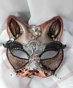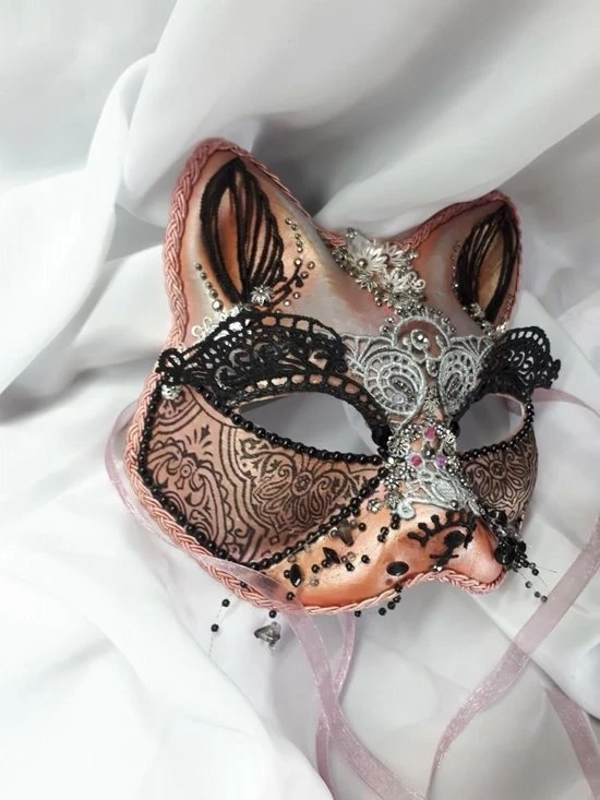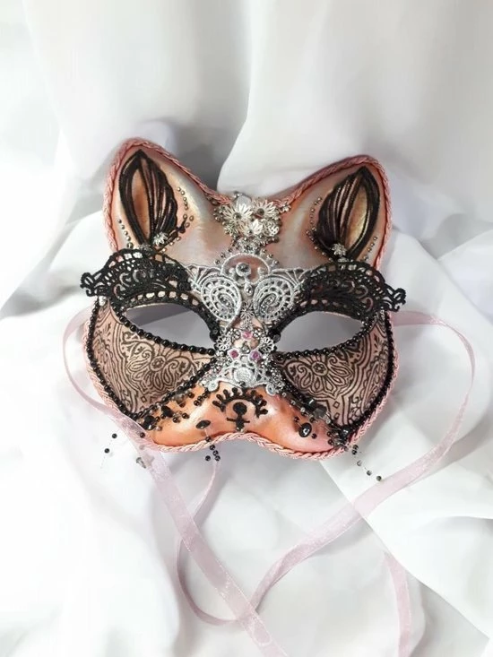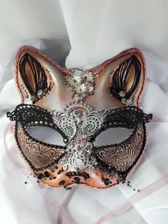 Handgemaakt masker in Venetiaanse stijl, fantasie kat met zilver en zwart kant ingelegd met stenen en metalen bloemen.
