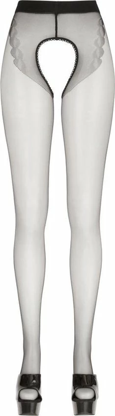 Zwarte panty met een patroon van een paar genaaid in het materiaal. De panty’s zijn volledig crotchless. Met een versterkte teen deel. 20 denier.