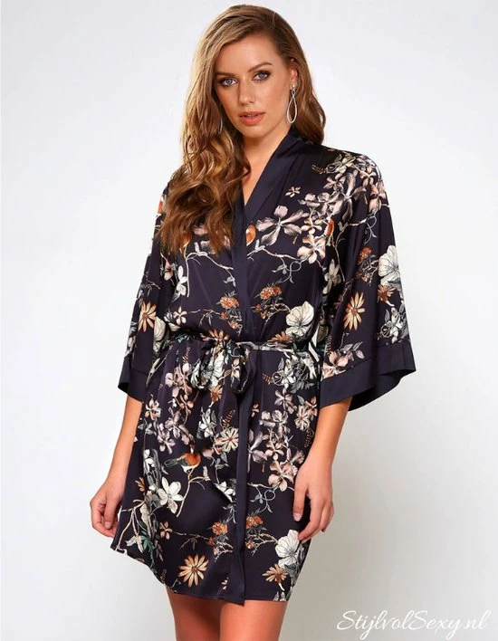 Tags: Zwarte avondjas, Satijnen kimono, Luxe badjas, Dames ochtendjas