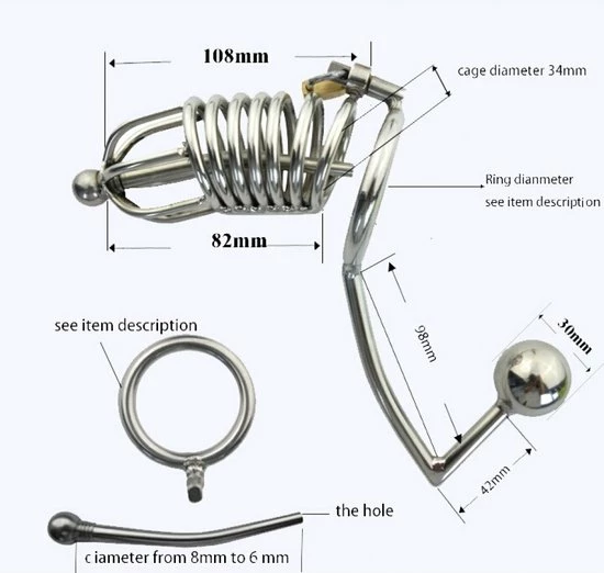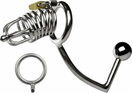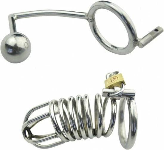 Verneder de onderdanige man en stimuleer tegelijk zijn penis! Dat doe je door een kuisheidskooi te combineren met een dilator, een plug die in de plasbuis wordt ingevoerd, plus is deze peniskooi voorzien van een buttplug kogel.