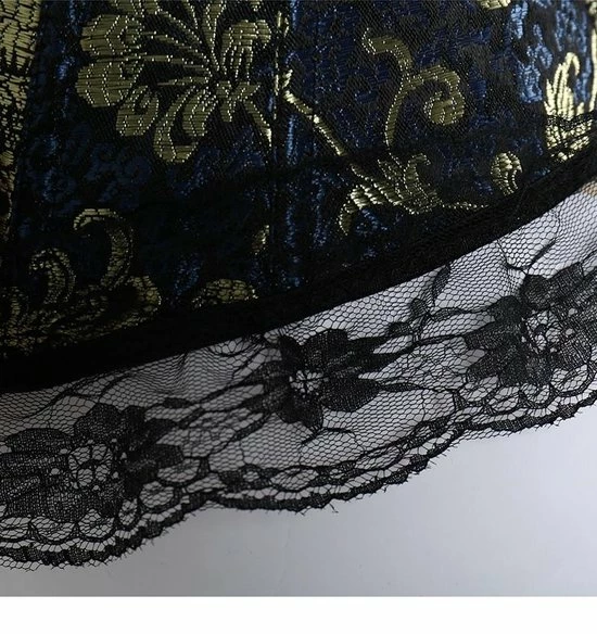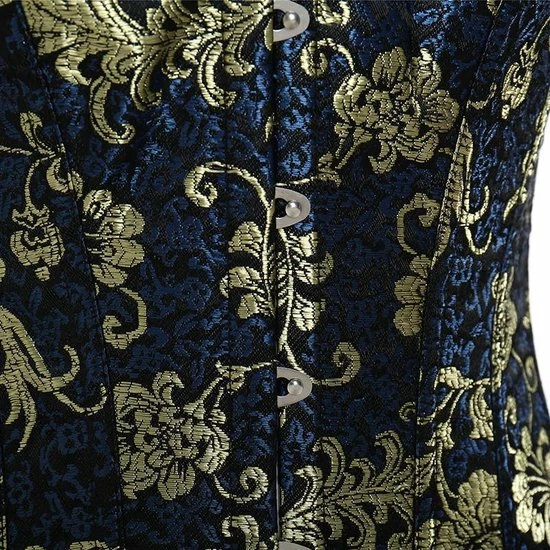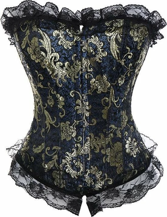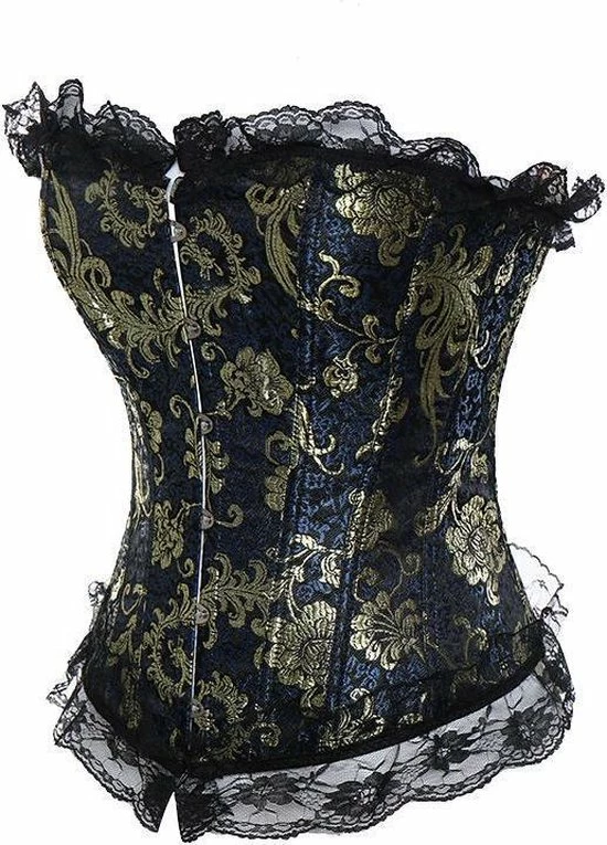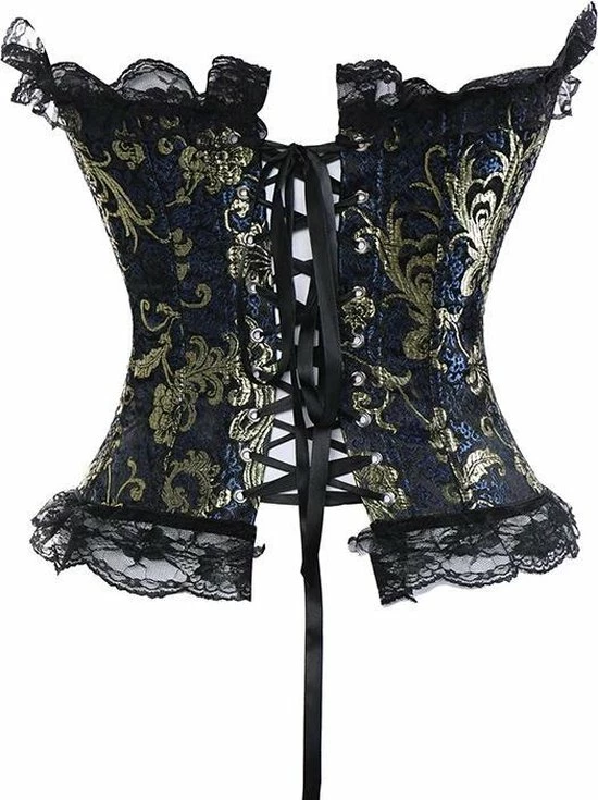 Vintage korset Valerie is een prachtig klassiek korset in de kleur blauw, zwart en goud. De stof is bewerkt met een mooi stijlvol bloemen patroon. Het korset van is hoge kwaliteit. Aan de voorzijde heeft het korset een metalen haaksluiting en aan de achterzijde een sexy vetersluiting. De vetersluiting is voorzien van een mooi zwart satijnen lint. Door de vetersluiting is het korset perfect op maat in te rijgen op je lichaam, waardoor je een optimaal draagcomfort hebt. Aan de bovenzijde en onderzijde van het vintage korset is een mooie afwerking gemaakt met decoratief zwart kant. Vintage korset Valerie heeft een stijlvolle verleidelijk uitstraling waarbij je je super vrouwelijk en begeerlijk voelt.
