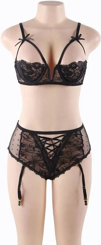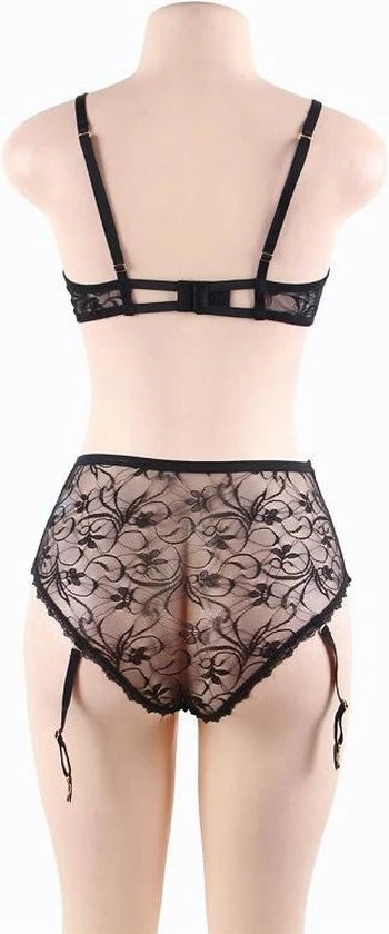 Ben je ondeugend en op zoek naar een sexy lingerie setje waar je veel plezier van kunt hebben? Bekijk dan dit zwarte kanten setje eens! Dit doorzichtige zwarte lingerie setje heeft een kanten open beha met verleidelijke bandjes die je mooie decollet? benadrukken De kanten beha heeft beugels in de cups en een meertraps beha sluiting aan de achterzijde. Het broekje is van doorschijnende zwarte kant met bevestigingen voor jarretels. De jarretels zijn los, dus je kunt zelf bepalen of wel of niet gebruik wilt maken van de jarretels. De jarretelbandjes zijn verstelbaar en zijn voorzien van goudkleurige metalen bevestigingen voor aan het broekje en aan de kousen. Deze sexy setje is een charmante uitnodiging voor jou en je geliefde om samen heel veel romantische momenten te beleven.