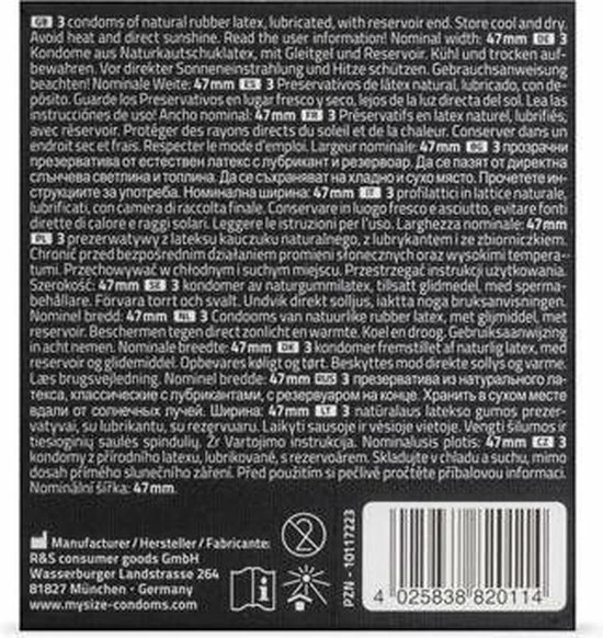 Deze condooms met een breedtemaat van 47 mm zijn strakkere condooms met de volgende afmeting: