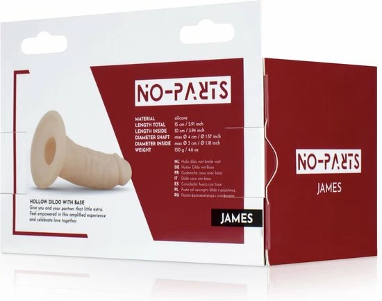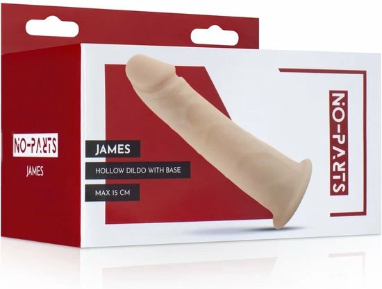 James is een holle dildo die men over de penis draagt en door zijn formaat perfect geschikt voor beginners. Deze dildo heeft een realistische vormgeving met een lichte curve en een geaderde flexibele schacht voor extra stimulatie. De binnenkant is glad. De dildo is gemaakt van lichaamsveilig siliconen en heeft een brede basis.