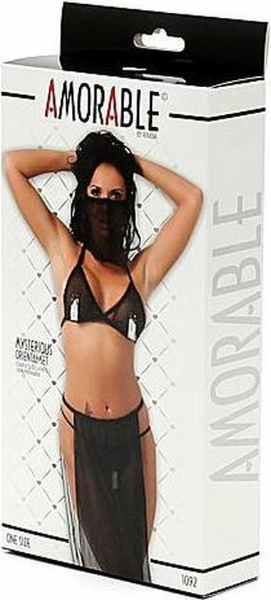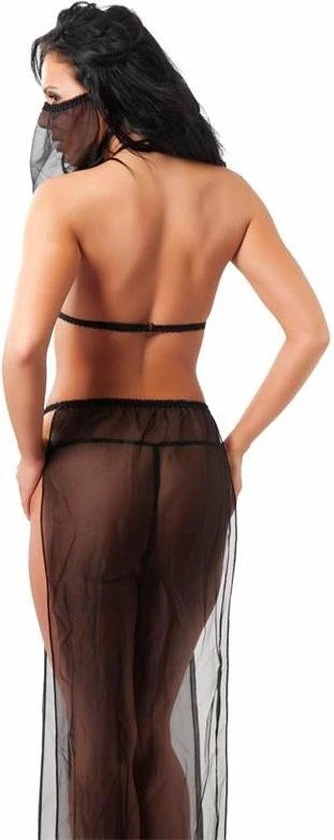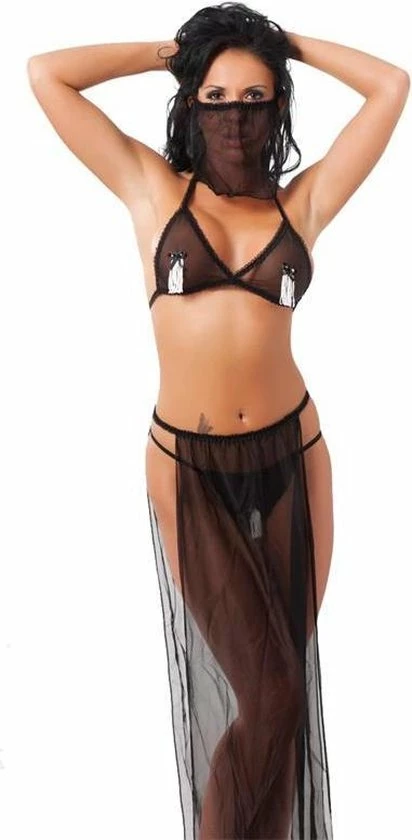 Mysterieuze buikdans outfit. Dit oosterse uniform wordt compleet geleverd met bh , g-string , mond sluier en lange rok.