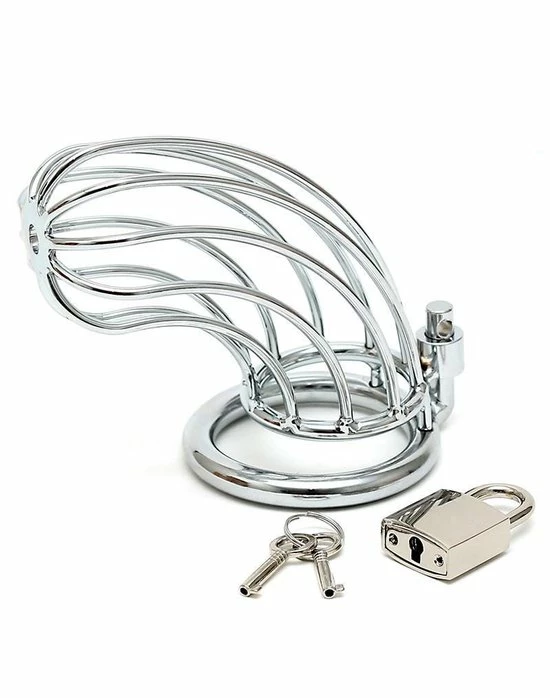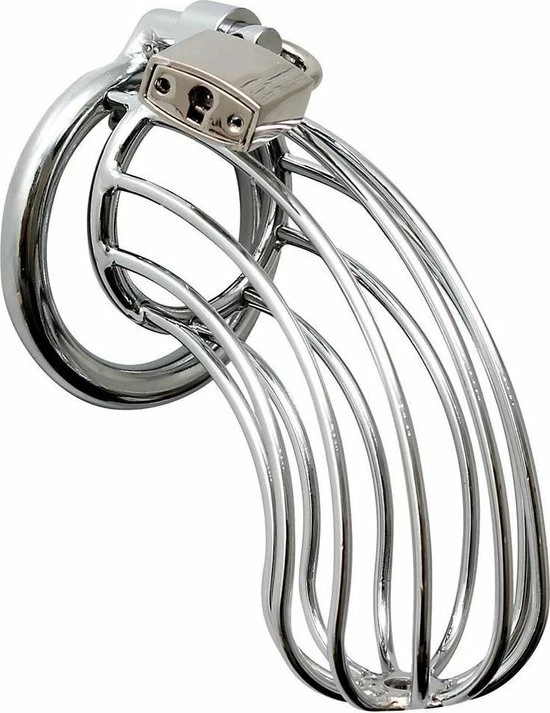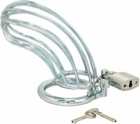 Metalen Peniskooi met hangslot Mooie peniskooi gevormd zodat de penis er makkelijk in gaat en goed zit. De voorste ring heeft een doorsnede van 45 mm en de kooi een opening van 35 mm. de lengte van de kooi is ruim 10 cm
