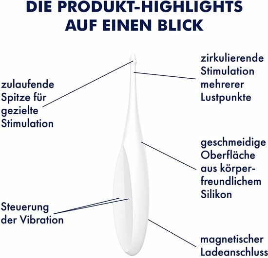 Twirling Fun heeft een smalle en onbuigzame punt die krachtige, circulerende trillingen geeft aan alle erogene zones, inclusief de tepels, clitoris of schaamlippen. De pinpoint vibrator biedt 12 vibratieprogramma’s, samengesteld uit 5 intensiteiten en 7 ritmes die te bedienen zijn door middel van de intu?tieve + en – knoppen. De gerichte, circulerende trillingen zorgen voor een nauwkeurige stimulatie van de erogene zones.