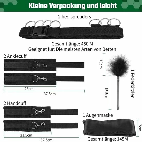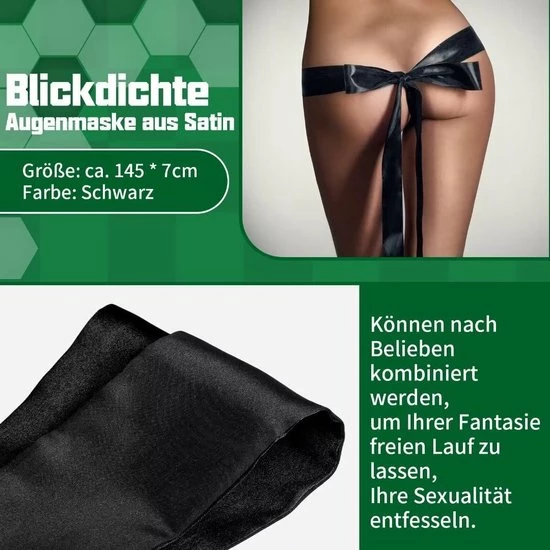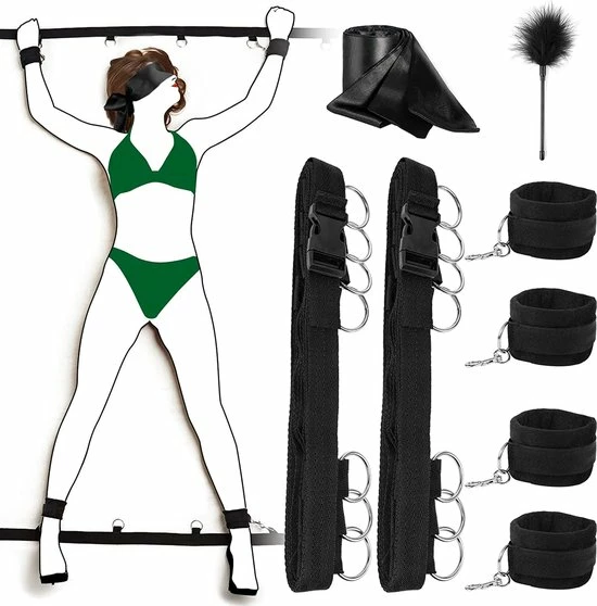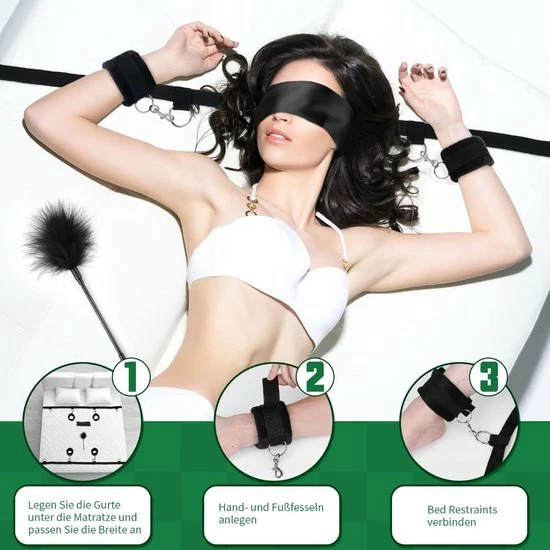 Domineer in bed ondoorzichtig oogmasker van satijn (ca. 145 x 7 cm), 4 sekshandboeien voor polsen en enkel, 2 gescheiden spreidingsbanden. Kan naar wens worden gecombineerd om je fantasie de vrije loop te laten en je seksualiteit te ontketenen.