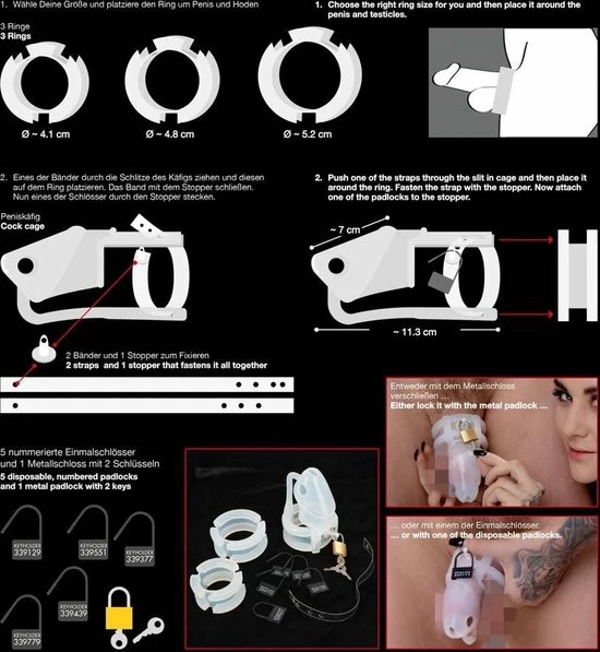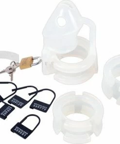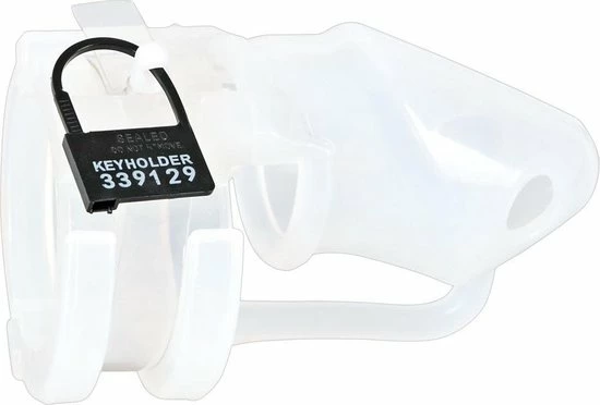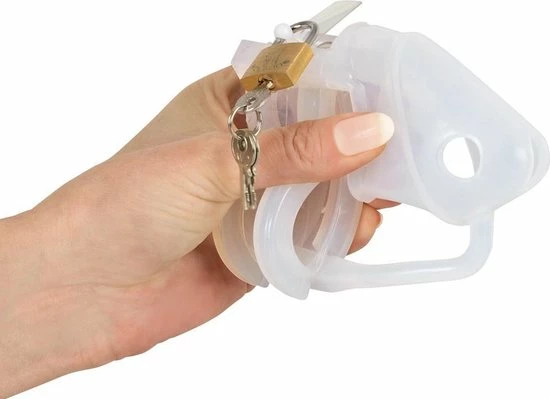 Met deze transparante peniskooi inclusief slotje heb je alles in huis om de controle over je penis uit handen te geven. Deze chastity set heeft 3 ringen met verschillende diameters zodat deze kuisheidskooi altijd past. Daarnaast heeft hij 2 type sloten, een metalen slotje met sleutel en wegwerpslotjes die voorzien zijn van een speciale code. Ontsnappen aan je kuisheid is in geen geval mogelijk. In vergelijking met een stalen peniskooi is deze siliconen kooi aangenaam licht in gewicht en comfortabel om te dragen. De uitgebreide set bevat de volgende onderdelen: 1 Kuisheidskooi, 3 ringen, 2 lussen met openingen 1 stopper 1 metaalslot met 2 sleutels, 5 Plastic sloten met gedrukte getallen. De totale lengte bedraagt 11,3 cm, lengte penishuls 7 cm met een doorsnede van 3,5 cm. De eind ringen hebben een diameter van 4,1 cm, 4,8 cm en 5,2 cm zodat hij altijd past. Deze kuisheidsgordel is gemaakt van siliconen.