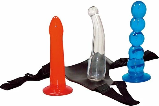 Zwarte verstelbare string met open kruis en een opening voor 3 soorten voorbind dildo’s. Bedenk hoe je je partner wilt penetreren en leef je uit. Gebruik wat glijmiddel voor meer genot.
